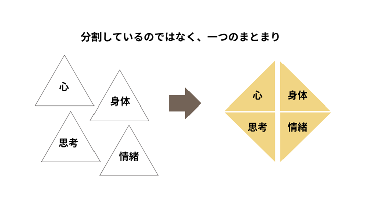 ゲシュタルトセラピーをつくったパールズ夫妻は「心」「身体」「思考」「感情」は分割できないもの、つまり意味のある一つのまとまり(全体性)であると語った。心が痛めば、身体も痛む。両者は切り離せない関係なのだ。