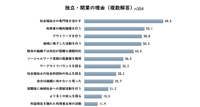 下のグラフは、社会福祉士として独立・開業の道を選んだ人が「なぜ、独立・開業したり、フリーランスになったりするのか?」という理由をまとめたものです。