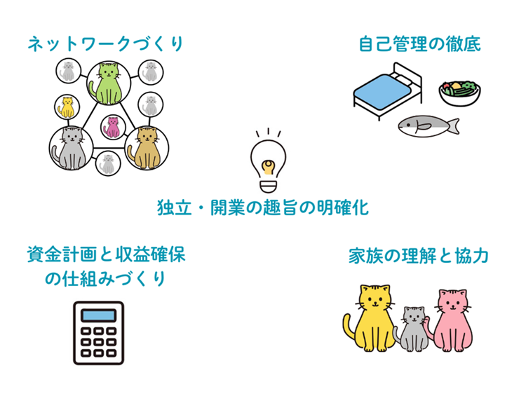 また、初期の資金計画と継続的な収益確保のしくみづくりも欠かせません。当面の生活費や事業に必要な資金を確保しておくこと、継続的な依頼や契約につながるようなしくみを構築していく視点が必要です。
