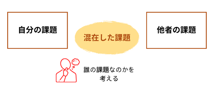 自分の課題とは、自分で選択でき、その結果に自分が責任を負うもの、他者の課題は、他者が選択し、その結果に他者が責任を負うものである。自分の課題、次に他者の課題、最後に、混在している課題を取り上げ、「これは一体、誰の課題なのか?」と問いかけ、最終的に、自分と他者、2つの課題に整理し直す。