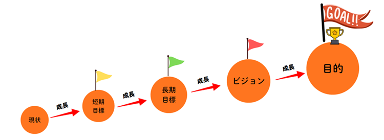 • 目的:「ずっと追い続けるもの」であり、目指す対象、理念、価値となるものです。具体的には、「自分らしさの追求」や「幸せな人生を送る」などがこれにあたります。