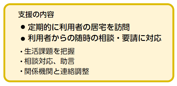 主に居宅で一人暮らしの障害のある人を対象に、週1回以上の間隔で定期的に訪問したり、利用者側からの連絡を受けてその場で相談に応じたり、場合によっては即時訪問したりする見守りサービスのこと。一人暮らしでなくても、同居者に障害・疾病等があって、緊急時の支援が見込めない状況にある人についても利用可能です。利用期間は原則1 年間(必要があれば更新も可)。