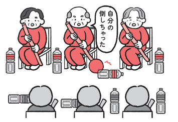 1. 参加者は3名ずつの2チームに分け、互いに向かい合うように座ります。各チームの足元には、ピン代わりとなる「少量の水を入れたペットボトル」を4本ずつ準備します。