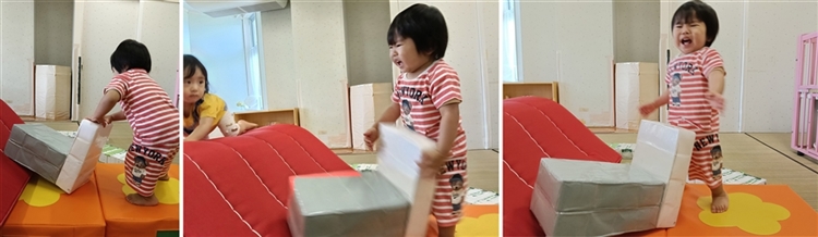 牛乳パックで作ったイスを押して遊ぶのが楽しい様子のKさん。手を置いて押すのにちょうど良い高さだったようで、保育室の中をあちこち進んでいました。畳スペースへ行く段差はどうするのかなと見守っていると、背もたれを持ち、イスをぐっと持ち上げて段差の上に置く姿がありました。