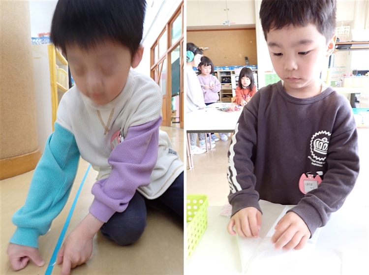 ならば「ティッシュで作ったらどう?」「ほら、やっぱりやわらかいからとばなかった」と会話をしながら、今日も作っていました。廊下で飛ばしているそらくんが「長いものはかりたい」と。リボンをもってきて廊下に貼りました。どのくらい飛んだのか――今までは目分量でしたが、長さを測りたい気持ちが生まれてきました。
