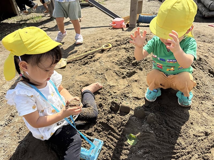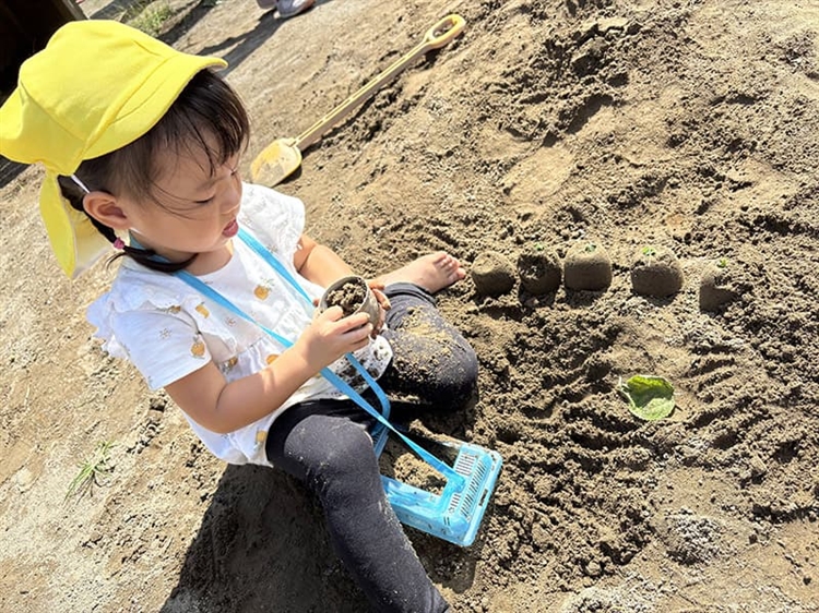 園庭でカップに砂を詰め、型抜きをする2歳児のNちゃん。端が崩れてしまうと、「あ~ぁ」と言いながら崩して、もう一度型抜きしなおし、2個3個と増えていきます。近くの葉っぱを摘んできて上に飾り、「これはね、お誕生日のケーキ!」とニコッと笑って教えてくれました。