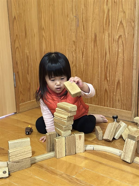 積み木の向きを縦にしたり横にしたりしながら、どの置き方が安定するのかを確かめるように工夫する姿が見られました。積み木が倒れてしまうと一瞬驚いた表情を見せますが、すぐに気持ちを切り替え、自分で積み直そうとします。
