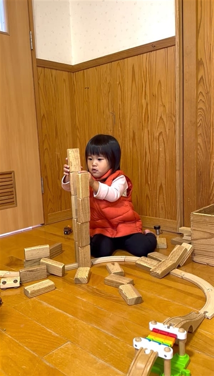 木製の積み木と線路を使って、2歳児のEちゃんが遊び始めました。初めは線路の上に積み木をそっと置き、トンネルをつくって楽しんでいましたが、積み木を重ねていく中で、次第に「もっと高くしたい」という思いが生まれたようです。