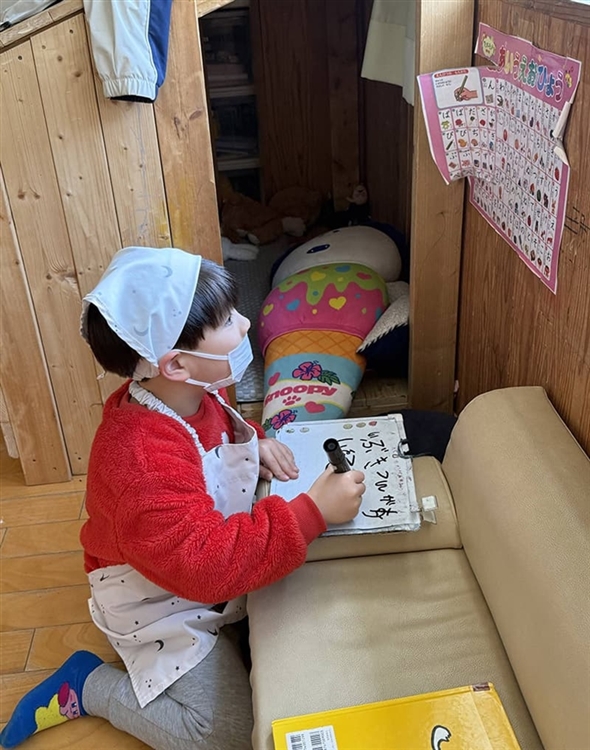 一人静かに、別の部屋にあるひらがな表の前に向かい、真剣な表情で文字を見比べながら書き進めていました。書き終えると満足そうに食事の部屋に戻っていく姿から、人に頼ることや自分で考えて行動する経験を重ねながら、あきらめずにやり遂げる力や学びに向かう力が育っていると感じました。