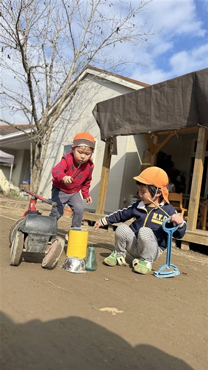 園庭に置いてある太鼓の楽器を見つけた3歳児のSくん。「何か叩くものはないかな?」と園庭を探し、途中で見つけた木の枝で太鼓を叩くと、いい音が鳴りました。長い木の枝や短い木の枝で叩き、音の違いを聞き比べたり、高いとこから石を落として「ポンッ」という音を楽しんだりする姿も見られました。その楽しさを仲良しのお友だちにも感じてほしくて、木の枝を探してあげました。