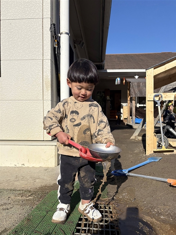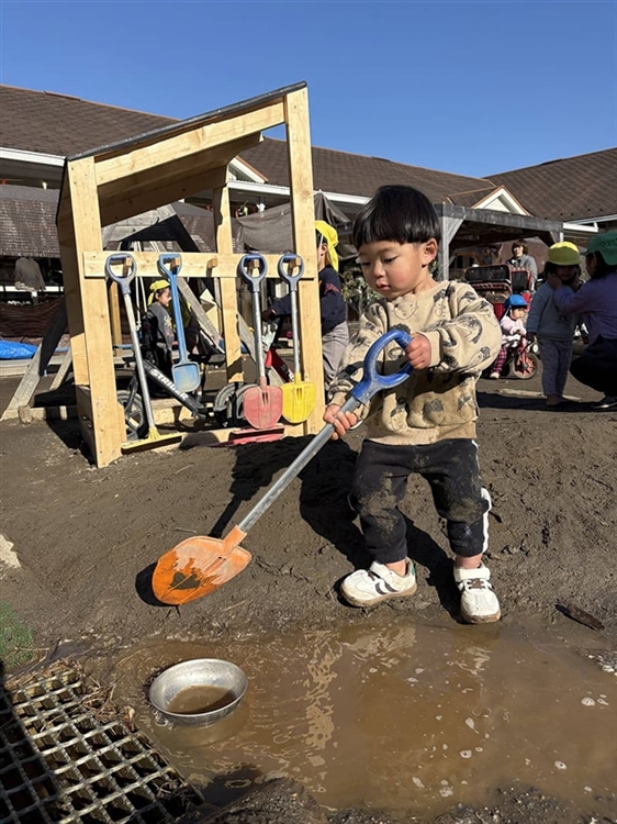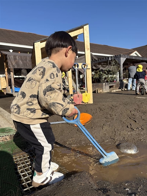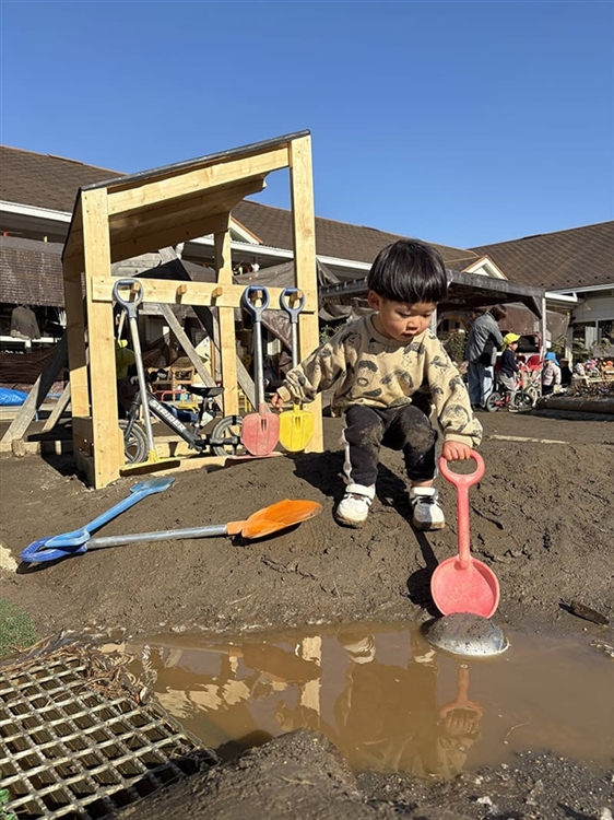 小川につま先がつくこともありましたが、見事、お皿を取ることができました。大人にとってみれば柄の長いほうが取りやすいと感じますが、Sくんは小川に足をつけたくないという思いから、最初に一番柄の長いシャベルを使い、そこから徐々に柄の短いシャベルに持ち替えました。さらに、取り方や自分の立ち位置も変えて、取ろうとしていました。