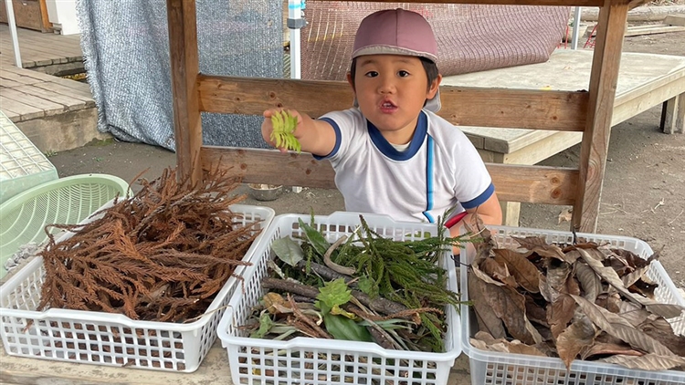 すると、裏山に一緒に拾いに行った4歳児のRくんが屋台に座り、「これどうぞー!」と、お店の店員さんになりきってくれました。屋台だったので、Rくんにはお店に見えたようで、周りにいるお友だちに嬉しそうに呼び込みをしているようでした。
