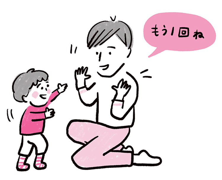 さらに、くすぐりや高い高いなどのスキンシップ遊びでも、ひと工夫してみましょう。遊びの途中で、大人はあえて一度行動を止め、子どもが「もっとやってほしい」という表情で見てきたら、「もう1回ね」と言って遊びを再開します。人の目を見ることの「効果」(してほしいことをやってもらえた!)に気づいてもらうための方法です。