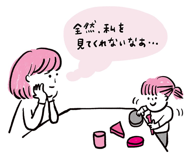 また、何か好きな遊びに集中していると、まわりの人の存在が見えにくくなり、結果的にあまり目が合わない子もいます。目の前に好きな物がある状態で正面に大人が座っても、好きな物の先にいる人に意識を向けることがむずかしい場合があります。私の臨床経験のなかでは、このタイプの子は、正面よりも横並びか対角で座るほうが、視線が合いやすくなる印象があります。