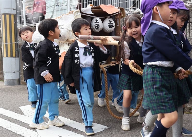 今日のだんじりパーティには、すべてのクラスの子たちが招待されています。総勢60名ぐらいで力を合わせてだんじりを曳きます。