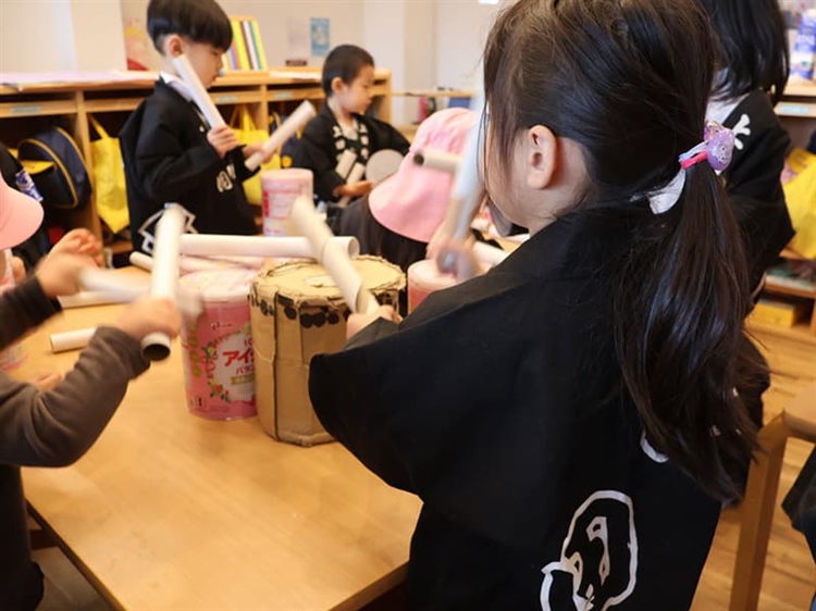 お部屋では、太鼓チームがいろんなクラスの子に太鼓の叩き方を伝えます。