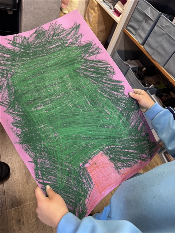 クレヨンをしっかりと握って、画用紙いっぱいに大きな木を描きました。