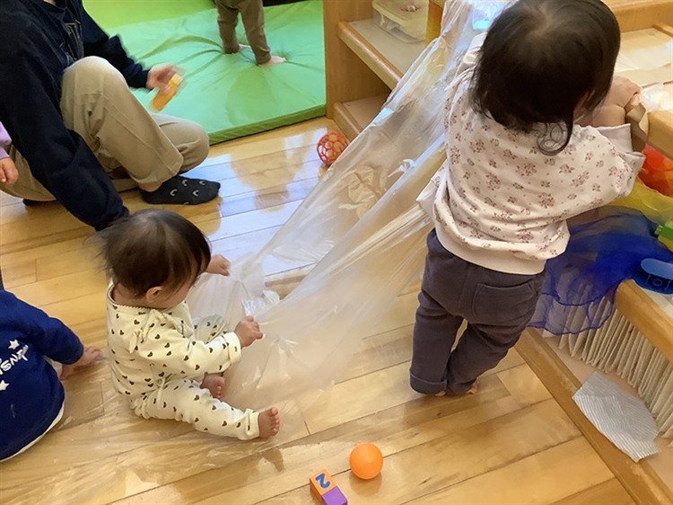 ビニールを登っていたお友だちに続いて、一緒に登ろうと挑戦していましたが、他のお友だちが登っている最中にビニールに穴があいてしまいました。