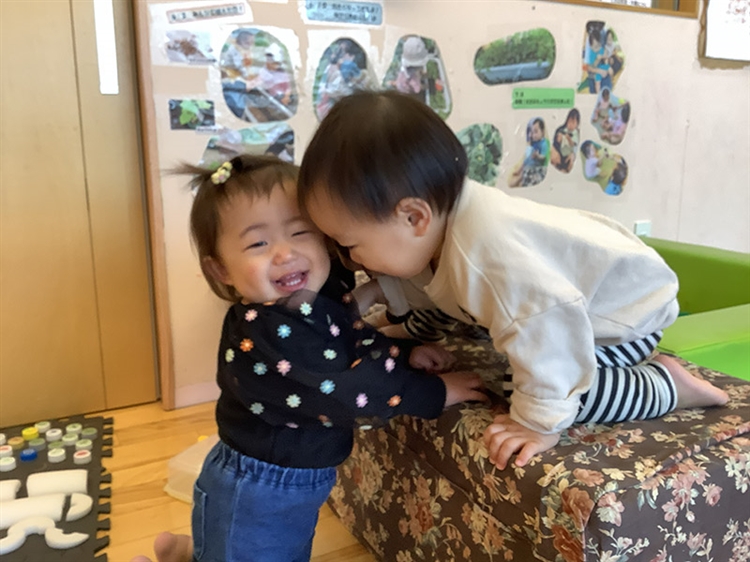 偶然の出来事をきっかけにやり取りを繰り返し、お友だちの反応を見て笑い合うなど、楽しむ姿が見られました。その後も他のお友だちが来てやり取りが広がっていきました。