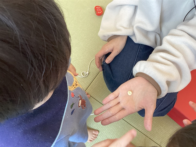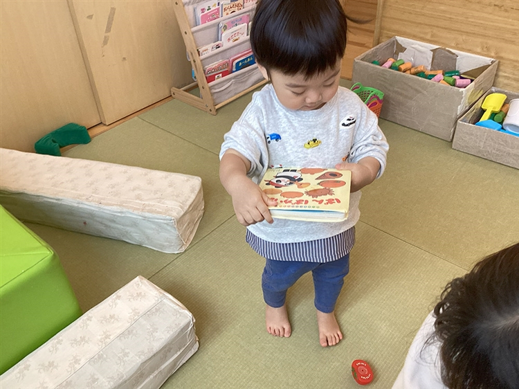 保育者が絵本の一部分を口ずさみながら粘土の形を作っていると、それを聞いたYくん(1歳10か月)が、その絵本を持ってきてくれました。