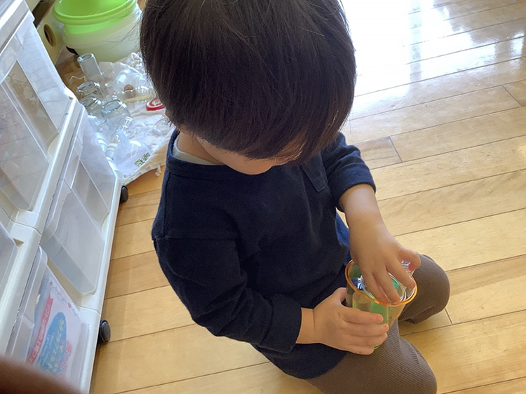 前日、お部屋のままごとでコップを重ねて遊んでいたお友だち。コップがうまく重なり、とっても嬉しそうでした。