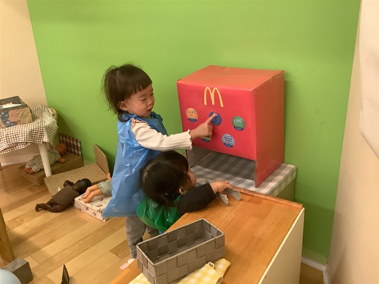 ひよこ組のお部屋に行くと、見たことのあるものを発見。二人でしばらく観察していたのですが、勇気を出して一人が押してみました。