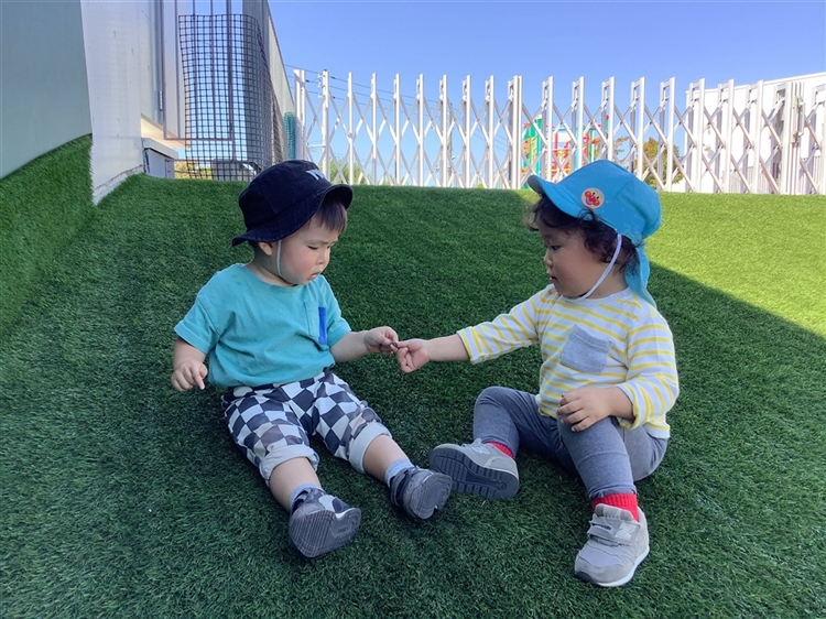 元気に走り回って楽しんでいたお友だちとマイペースでのんびりスロープに座っていたお友だち。座り込んでいるお友だちの様子に気づいて、そっとそばに行き、落ちていた石を拾い「はい、どうぞ」と渡して、しばらく一緒に過ごしていました。