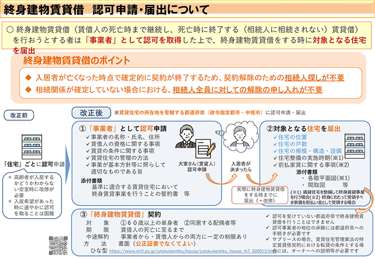 改正前の制度では、終身建物賃貸借を行う賃貸住宅ごとに認可を受ける必要がありましたが、改正後は、事業者(賃貸人)として都道府県知事等の認可を受けておき、実際に高齢者の入居が決まったら、住戸番号や賃貸住宅の構造等の届出を行えばよいことになりました。
