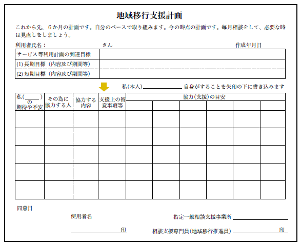 地域移行支援の実施にあたって、向こう6か月間を目安として、地域移行を希望する本人の目指す目標、期待や不安、協力者や協力内容、支援上の留意事項、協力・支援の実施時期などを記載した計画書のこと。指定一般相談支援事業所が作成し、適宜見直しや必要に応じた変更を行います。