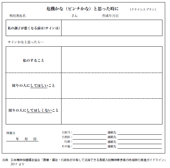本人の「状態悪化のサイン」とその対処方法を一覧にした計画表のこと。精神科病院入院患者や施設入所者の地域移行に際して、作成されます。状態が悪くなるとどのような症状が出るのか(どういうときに出やすいか)、その際にどう対処すればよいかを、あらかじめ本人と支援者で確認して、家族、ホームヘルパー、訪問看護師、デイケアや作業所など日中を過ごす場所のスタッフと共有しておくものです。