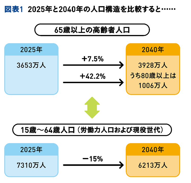 こうした課題のピークは、2040年頃とされます(2040年の人口構成は図表1参照)。