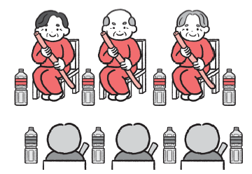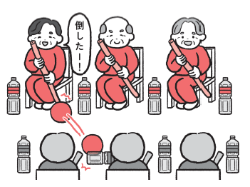 1. 参加者は3名ずつの2チームに分け、互いに向かい合うように座ります。各チームの足元には、ピン代わりとなる「少量の水を入れたペットボトル」を4本ずつ準備します。